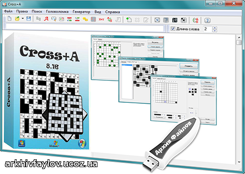 Компьютерная программа Cross+A предназначена для решения кроссвордов, сканвордов, криптарифмов, судоку и японских кроссвордов (черно-белых и многоцветных нонограмм), а также для поиска анаграмм, словосочетаний, цепочек слов и метаграмм.