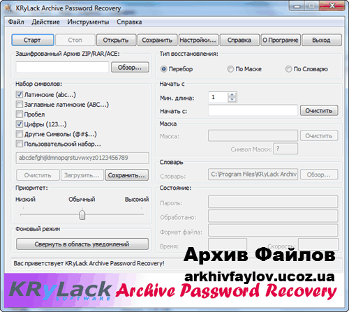 KRyLack Archive Password Recovery - мощная программа, предназначенная для восстановления паролей к архивам ZIP, RAR и ACE. Поддерживает операции с самораспаковывающимися (SFX) архивами. Имеет три режима восстановления - перебором, по маске и по словарю.